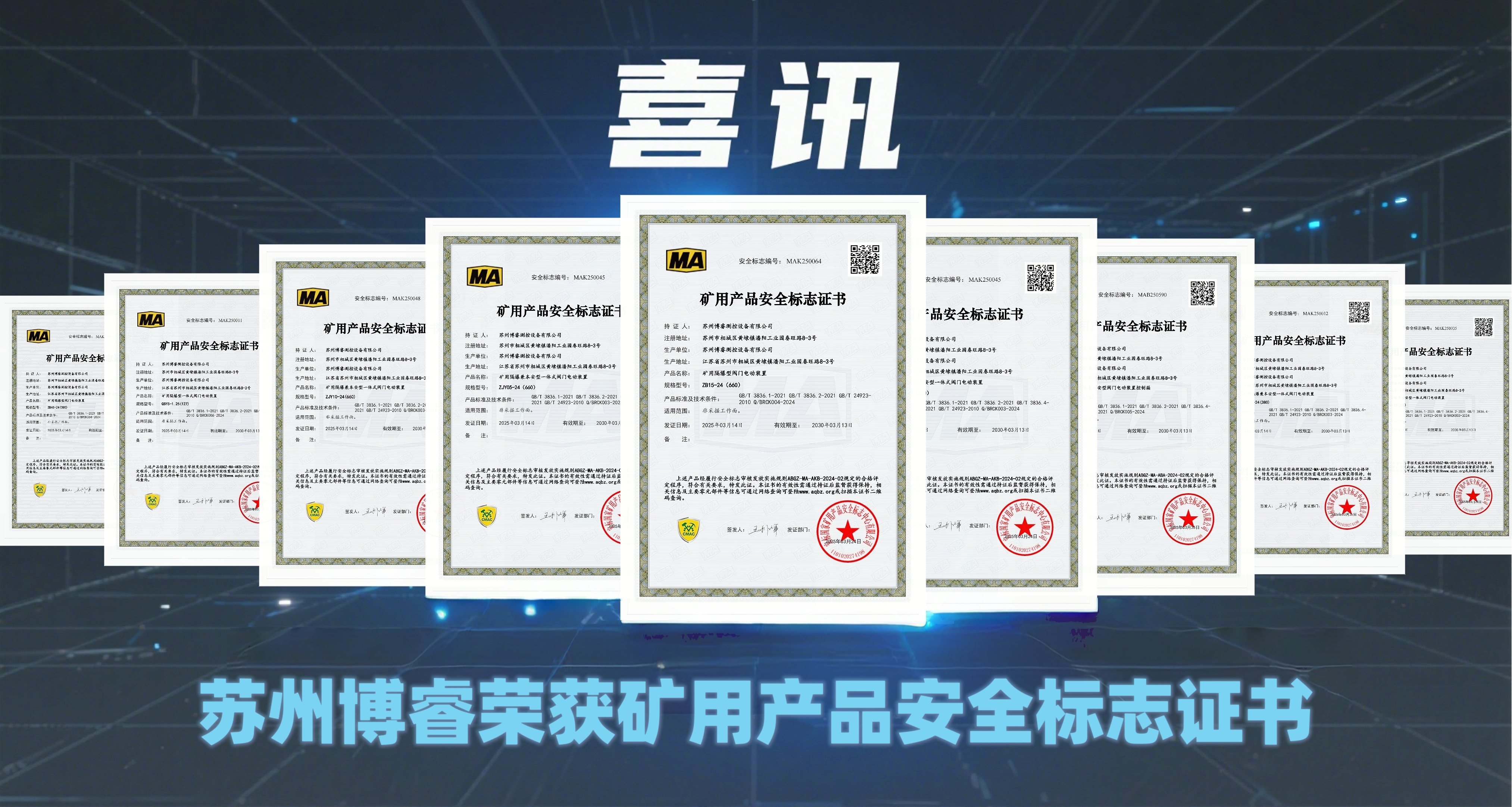 近日,蘇州博睿測(cè)控設(shè)備有限公司通過國(guó)家礦用產(chǎn)品安全中心的嚴(yán)格審核,成功取得礦用隔爆型閥門電動(dòng)裝置安全標(biāo)志證書(MA認(rèn)證)。